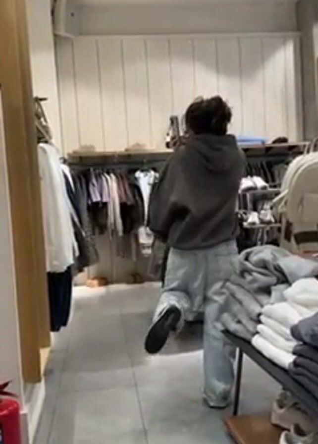 A woman stands in a clothing store, facing the camera. She is wearing a gray hoodie, light blue jeans, and white and black sneakers. Her hair is pulled back in a messy bun. In her hands, she holds a cellphone. Racks of clothes are visible behind her, as well as displays with folded items. The store is well-lit, with a modern, minimalist aesthetic. The woman appears to be looking at herself, possibly taking a photo or video.
