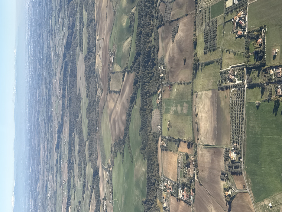 An aerial image captured from a high altitude presents a vast rural landscape under a clear, bright blue sky with a distant, possibly snow-capped, mountain range visible on the hazy horizon. The terrain below is characterized by an extensive patchwork of agricultural fields and natural woodlands. Fields display varying hues of green, indicating active cultivation or pasture, alongside shades of brown and tan, suggesting recently tilled earth or fallow land. Several fields exhibit distinct rectangular or irregular shapes, often bordered by linear tree plantings or narrow dirt tracks. Some cultivated green fields show faint striped patterns. Interspersed throughout the scene are numerous patches of dense, dark green forest or woodland, frequently following natural contours or forming boundaries between agricultural zones. Scattered residential properties are visible, particularly in the mid-ground and foreground. These typically consist of one or more terracotta-roofed buildings, often large villas, situated within private plots. Many of these properties feature well-defined driveways, green lawns, and extensive, organized rows of trees, such as olive groves, which cast elongated shadows across the fields and property lines due to the angle of the sunlight. Narrow, unpaved tracks and more defined roads traverse the landscape, connecting the various agricultural parcels and residential clusters. No discernible human figures or specific human activities are visible due to the high altitude of the perspective. The depicted location is within the general area of Cerveteri, Italy.