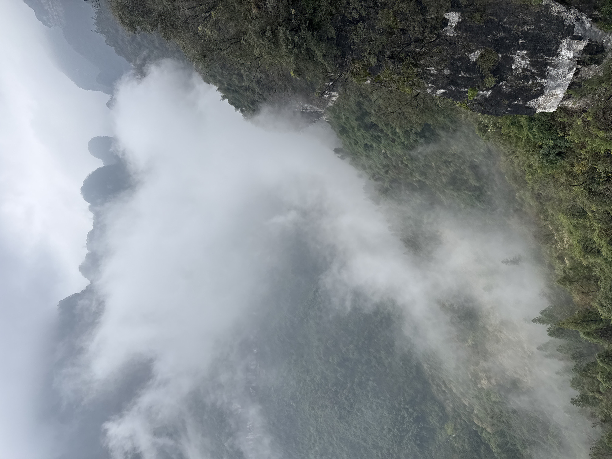 This image depicts a mountainous landscape within Yongding District, China, under an overcast sky. The scene is dominated by a deep valley filled with thick, white clouds or mist that obscure lower elevations and billow upwards. On the immediate right, a steep, dark grey rock cliff face, marked with lighter mineral streaks and patches of clinging green vegetation, descends sharply into the obscured valley. Beyond this immediate cliff, the slopes are densely forested with various shades of green foliage. In the midground and extending to the background on the left and center, multiple mountain peaks and ridges, also heavily forested, rise through and above the pervasive mist. The upper sections of these distant mountains are visible, with their irregular outlines partially softened by the atmospheric haze. No individuals, animals, or man-made structures are identifiable within the frame. The overall environment is one of rugged, densely vegetated terrain characterized by significant atmospheric moisture.