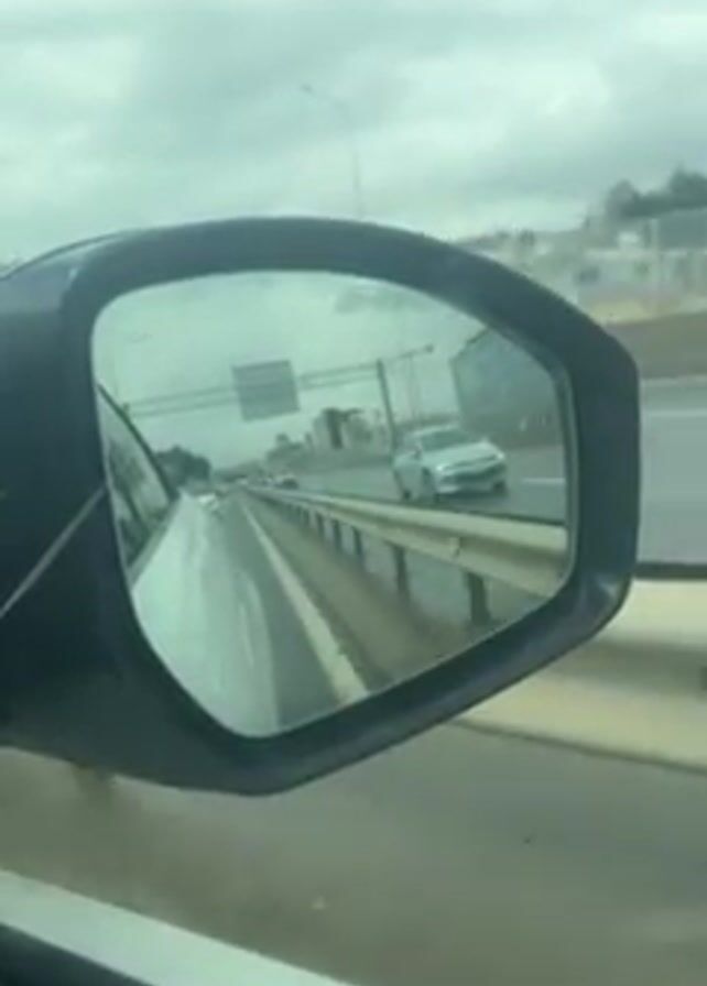 view from a car side mirror on a rainy day. The mirror reflects a highway with other cars and buildings in the distance. The sky is overcast, and the road is wet. The camera appears to be moving, suggesting the car is in motion.