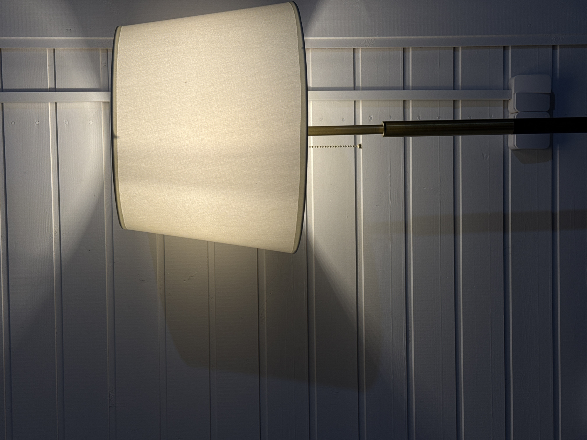 An interior scene in Starokorsunskaya, Russia, features an illuminated floor lamp positioned against a light-colored, horizontally paneled wooden wall. The lamp possesses a light beige fabric conical shade and a two-tone pole, brass-toned at the top and dark at the base, with a metallic pull chain hanging from beneath the shade. Light emanates from the lamp, illuminating the adjacent wall sections while casting a prominent shadow to its left. To the lower right of the lamp's pole, a white double electrical outlet and a vertical white trim strip are affixed to the wall. No individuals or dynamic actions are present in the image.