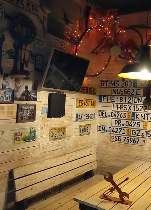 cozy corner of a room, possibly a bar or restaurant, decorated with a rustic, automotive theme. The walls are covered with light-colored wooden planks and adorned with an eclectic collection of items, including license plates from various countries, black and white photographs, tools, and a bicycle strung with colorful Christmas lights. There's a flat-screen television mounted on the wall, and a wooden table and benches create a seating area. A metal sculpture of wrenches sits on the table. The room is dimly lit by a warm-toned pendant light hanging above the table.