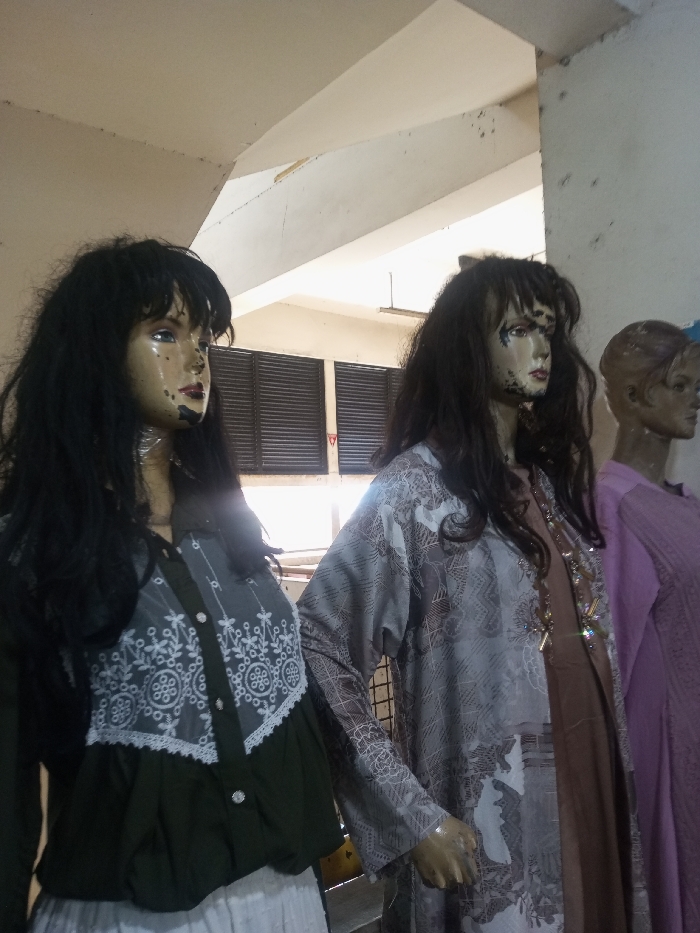 Three mannequins stand under a white ceiling with natural light from behind. The leftmost mannequin wears a green top with white lace over a white skirt. The middle mannequin has a brown dress with a gray patterned robe and a long necklace. The rightmost mannequin wears a pink dress. All three mannequins have dark hair, and the paint on their faces is chipped and worn.