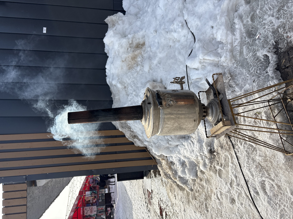 - "An outdoor winter scene in Astana, Kazakhstan, depicts a traditional, silver-colored metal samovar actively emitting white smoke from its central chimney" by FM-Ju5AS2, licensed under CC BY 4.0