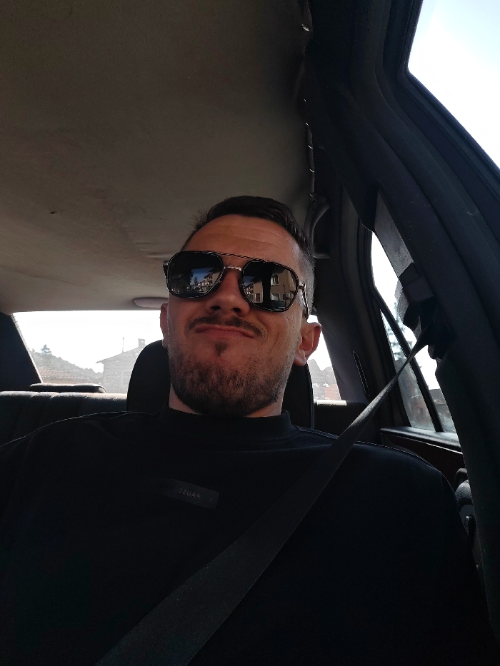 A male individual is seated in the front passenger seat of a vehicle, secured by a black seatbelt, within the city of Velingrad, Bulgaria