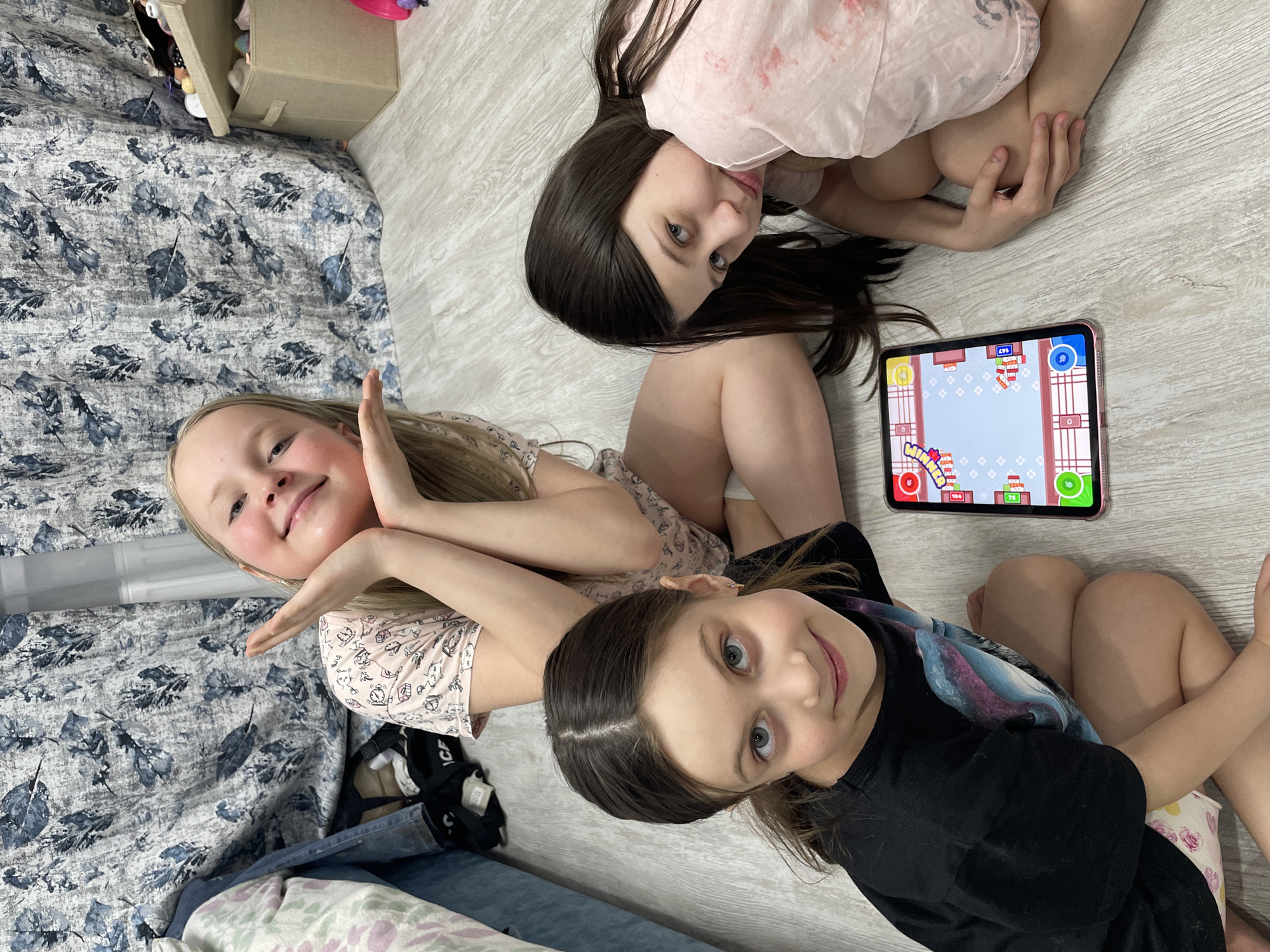 Three young girls are lying on a floor, looking up at the camera. One girl has long blonde hair and is wearing a light pink shirt with cartoon animal designs, and her hands are held up near her face. Another girl with long dark hair is wearing a light pink floral shirt. The third girl has dark hair and is wearing a black shirt. A tablet is positioned between the girls displaying a colorful game. In the background, there is a bed covered with a floral-patterned blanket and a tan storage bin. The image was taken in Izhevsk, Russia.