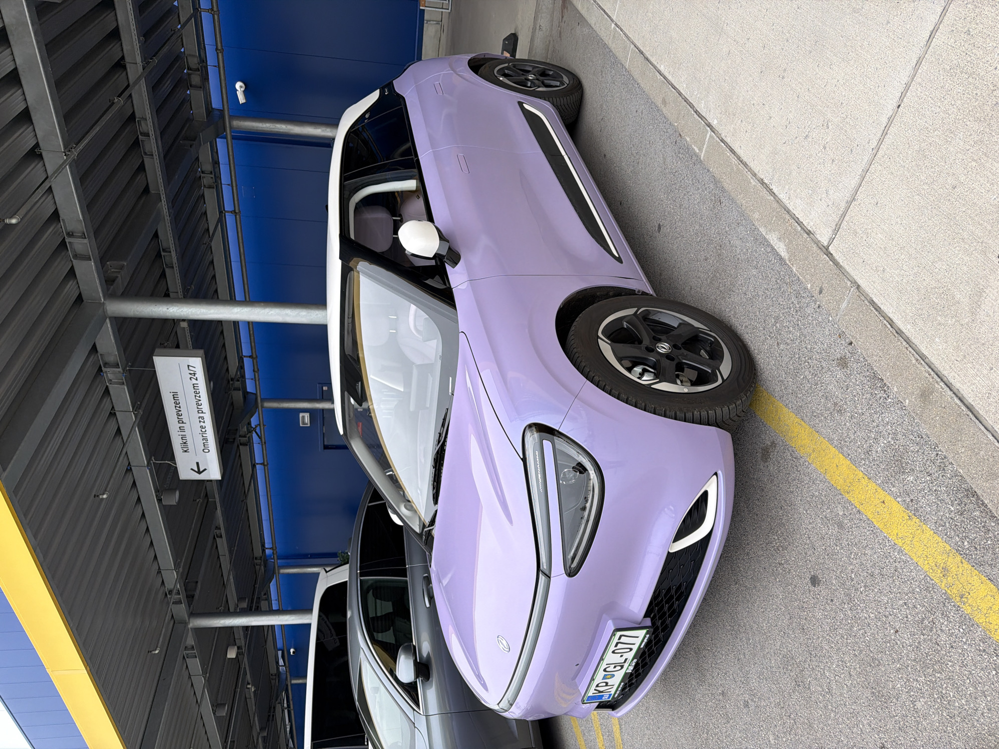 light purple compact car parked in a parking area, presumably in Ljubljana, Slovenia
