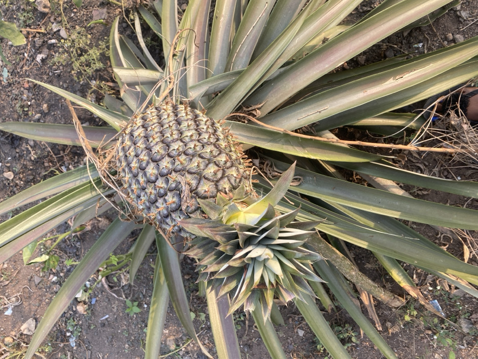 A pineapple plant sprawls across the frame. The mature fruit, displaying a patterned skin, rests at the center, topped with a characteristic crown of spiky green leaves. Long, pointed leaves radiate outwards, showcasing a blend of green and muted purple hues. The surrounding ground is a mix of bare earth and sparse vegetation, with small plants interspersed among the pineapple's foliage.