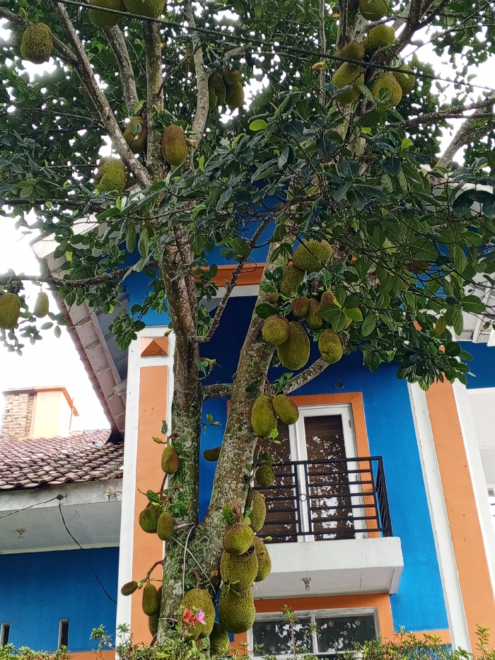 A jackfruit tree, heavily laden with fruit of varying sizes, dominates the scene