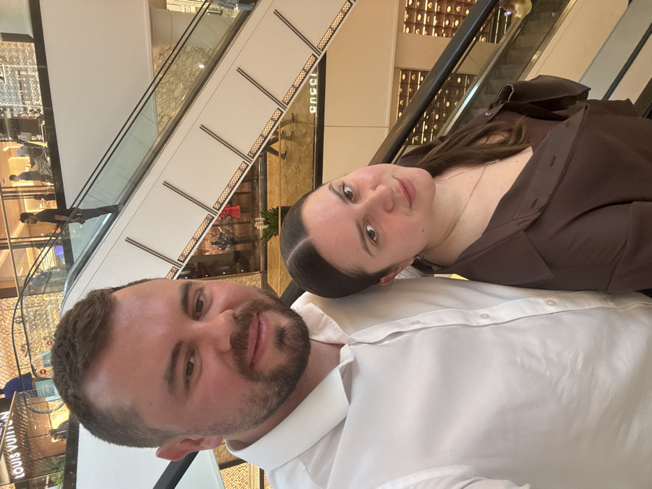 A man and a woman are pictured in a selfie-style photograph while ascending an escalator within The Dubai Mall in دبي, United Arab Emirates