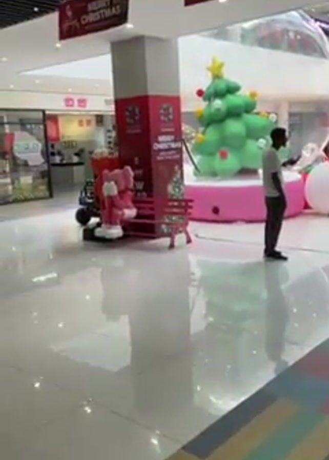 interior of a shopping mall decorated for Christmas. The mall has a glossy tiled floor that reflects the overhead lighting. In the center of the frame are Christmas decorations, including an inflatable Christmas tree with a star on top and a large inflatable snowman. A large transparent globe surrounds the Christmas tree. Several people, mostly men, are walking around the decorations. Some are looking at their phones, while others are walking and talking together. Overhead, banners wish viewers a "Merry Christmas and Happy New Year 2025." One of the columns is wrapped in a banner with the same message and a logo. The video also briefly shows a snack bar or juice bar with red chairs.