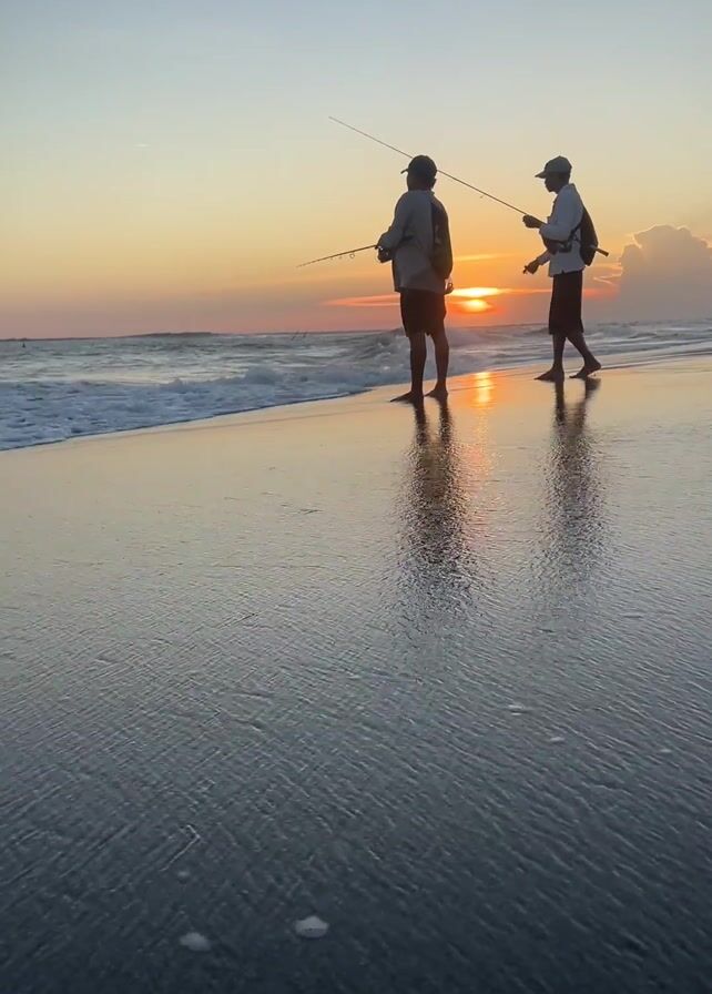 Two people are fishing on a beach at sunset. The sun is setting on the horizon, casting an orange glow on the sky. The men are silhouetted against the sun and their reflections are visible in the wet sand. They are both wearing hats and fishing rods. Waves are crashing on the shore.
