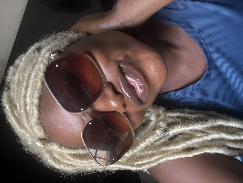 dark-skinned adult female in a close-up, chest-up portrait. She wears large, square-framed sunglasses with light-colored frames and brown-tinted lenses, obscuring her eyes. Her hair consists of blonde dreadlocks, some adorned with small metallic wraps or beads. Her full lips are glossy and slightly parted, showing a hint of a smile. She is wearing a ribbed top in a muted blue or dark teal color. Her left hand rests near her temple and hair. The background is dark and indistinct, indicating an indoor setting. The location is stated to be Gwarinpa, Nigeria.
