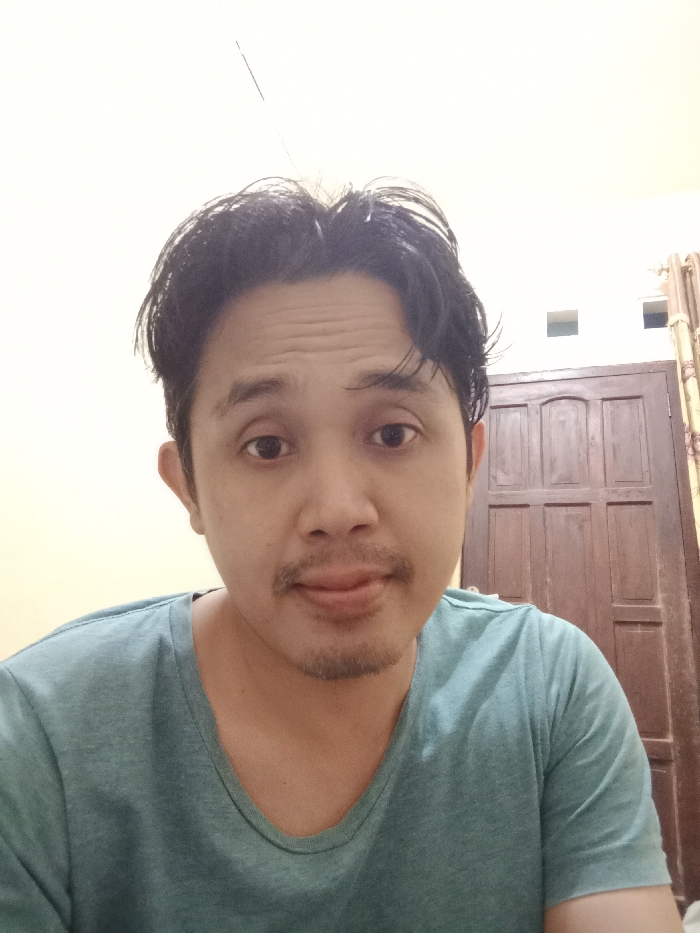 An adult male with dark, tousled hair, dark eyes, a short mustache, and chin stubble is depicted in a head-and-shoulders indoor portrait in Brangsong, Indonesia