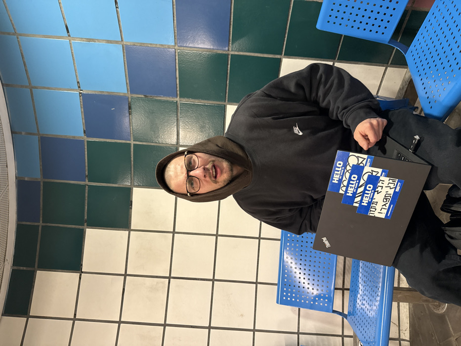 A man wearing a dark hooded sweatshirt and glasses sits on a blue metal chair. He's holding a black laptop covered in blue and white "HELLO" stickers, one written in Hebrew. The background shows a wall tiled with square tiles of blue, green, and white. Another blue metal chair is visible beside him. The image is rotated to the left.