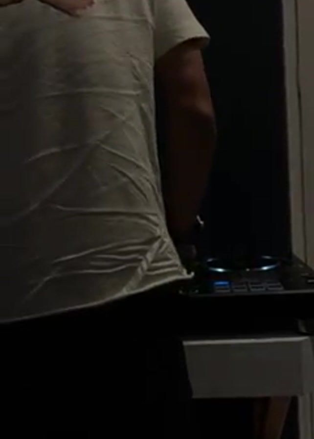person standing behind a DJ controller. The person is wearing a white t-shirt with a design on the back, and black pants. The DJ controller is sitting on a small white table. The background is dark, but there appears to be a dark blue wall behind the person. The DJ controller has illuminated buttons. The person's actions and the music suggest they may be DJing.