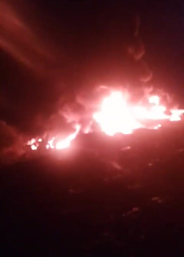 large fire burning at night. The flames are bright and orange, illuminating a dark, undefined ground in the foreground. There is a blurred red haze in the sky above the fire, possibly smoke. The scene is dark, with only the fire providing illumination. There are no visible people or identifiable objects other than the fire itself.