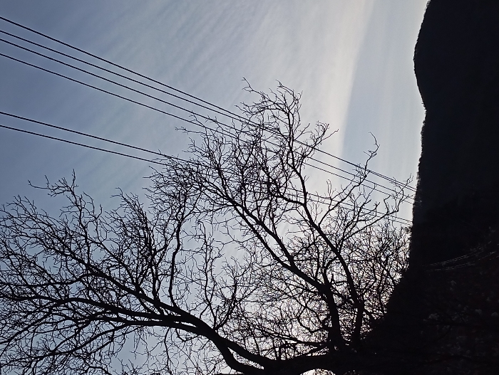 The image displays an outdoor, static scene located in Ribnitsa, Bulgaria, under twilight illumination. No individuals are present. The foreground and midground are dominated by dark silhouettes. A large, leafless deciduous tree occupies the left side of the frame, its intricate network of bare branches spreading across the upper-left and central areas. Below it, a steep, dark slope rises, supporting additional, less distinct silhouetted vegetation. Approximately five parallel black utility lines traverse the upper-right to lower-left diagonally, passing through or behind the tree's branches. The lines maintain consistent spacing. The sky, occupying the upper two-thirds of the image, displays a gradient from light blue-grey at the top to a lighter white-grey towards the horizon, featuring subtle, wispy horizontal cloud formations. A dark, silhouetted mountain range or a series of hills defines the distant horizon in the lower portion of the image. The environment is rural, combining natural topography with man-made infrastructure.