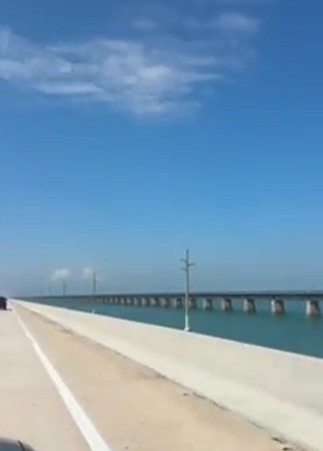 car driving along a wide highway bridge. The sky is blue with scattered clouds. The bridge stretches far into the distance, with power poles spaced along the side. The water below is turquoise green. A car is visible ahead in the same lane. The concrete barrier lines the side of the road.
