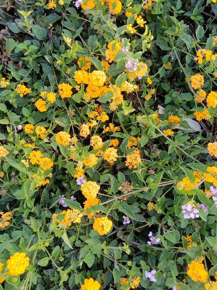 This image depicts a dense patch of flowering plants, identified as Lantana, located in East Los Angeles, United States