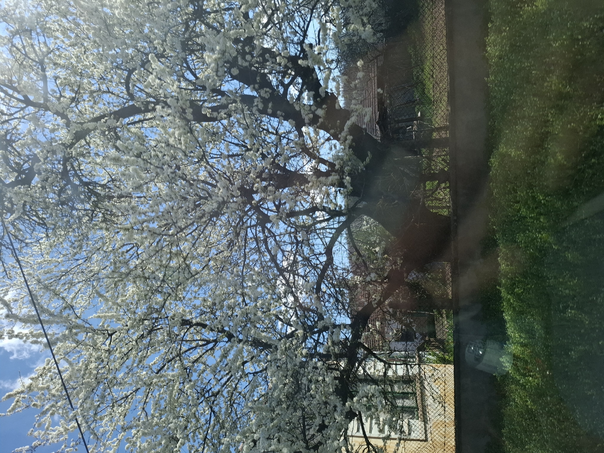The image captures a blooming tree with white flowers against a blue sky, possibly a plum or cherry tree, viewed from indoors through a window. The perspective is slightly rotated clockwise. Outside the window, there is a chain-link fence, a building with white-framed windows, a green lawn, and another building further back with a red roof. The reflections on the window obscure some parts of the scene. The specific location is the city of Smirnenski, Bulgaria.