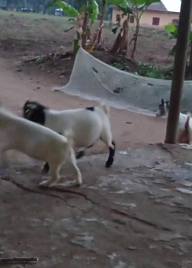 group of goats in an outdoor setting. Initially, two white goats are butting heads. One goat is predominantly white, while the other has a black head and patches on its body. After a brief fight, one goat runs away and falls onto its side. Then, the goats regroup and walk together toward a patch of banana trees. The environment appears to be a rural area with a dirt ground and vegetation. In the background, there are houses and palm trees.