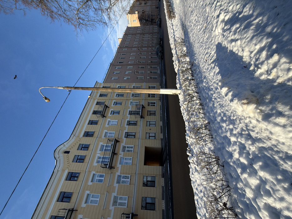 The image displays a winter street scene in Kronstadt, Russia, under a clear, bright blue sky. A prominent four-story building dominates the left, featuring pale yellow facades with white trim, numerous windows with both white and dark frames, and several balconies with black wrought-iron railings. A large, dark arched passage is visible at street level within this building. Adjacent to it on the right, a multi-story building with a light reddish-brown or pinkish-beige facade and numerous uniformly-sized windows extends down the street; several parked cars are discernible along its base. A dark asphalt street, appearing recently cleared, occupies the mid-ground. In the foreground, a snow-covered sidewalk or median strip runs parallel to the street, bordered by a row of bare, dark shrubs partially obscured by snow. A tall, light-colored wooden utility pole, painted white at its base, stands erect in the right-center, supporting a curved streetlamp fixture and overhead power lines that traverse the sky. A single dark bird is captured in flight against the blue sky in the upper right quadrant. No individuals are present in the scene.