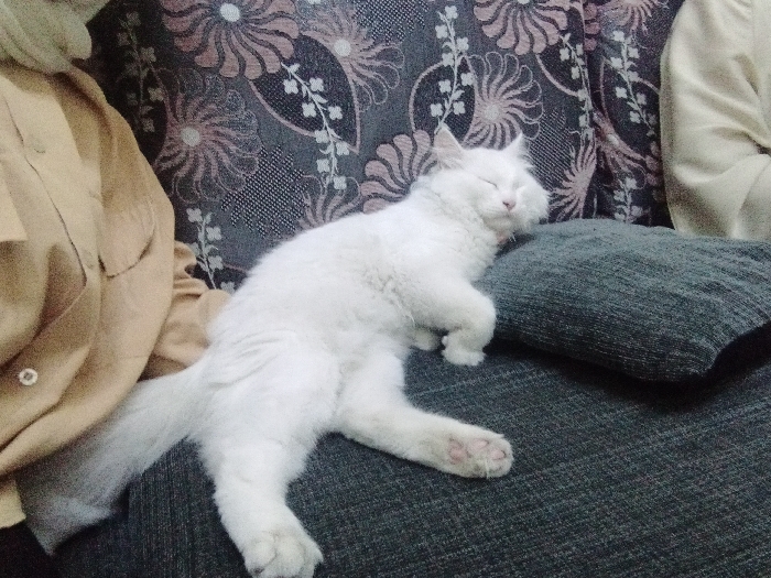 - "A long-haired, white cat is depicted resting on a multi-textured sofa in what appears to be an indoor domestic setting within Joubar Municipality, Syria" by FM-MMPOs1, licensed under CC BY 4.0