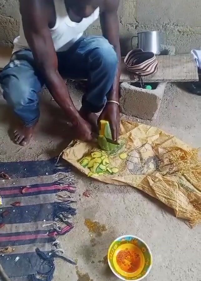 A man is squatting on the floor while slicing a green papaya with a knife. The man is dark-skinned, bald, and muscular. He is wearing a white tank top and jeans. He is barefoot. The papaya is being sliced on a piece of tan-colored burlap. The floor appears to be concrete. There is a colorful rug in the lower-left corner and a bowl filled with an orange liquid in the lower-right corner of the shot. In the background, there is a brick wall, and a mug and other items can be seen behind the man.