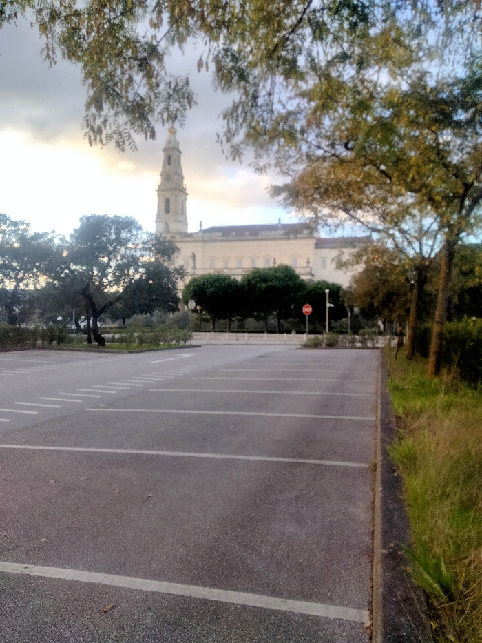 This image captures an empty outdoor parking lot foregrounding the Basilica of Our Lady of the Rosary in Fátima, Portugal