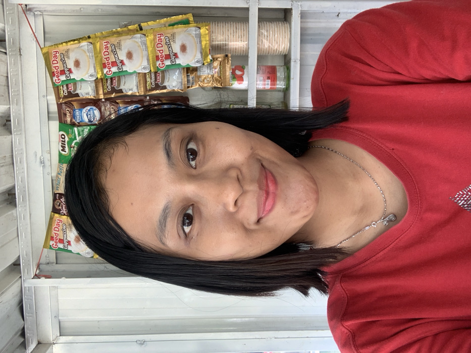 A woman with short dark hair wears a red t-shirt and a silver necklace. She is positioned in front of a shelving unit stocked with various food and beverage products. Items visible include "Good Day Cappuccino" packets, "Milo," and "White Koffie" mixes. In the background are stacks of disposable cups and a jar containing a reddish-colored product. The shelving unit appears to be part of a small shop or vending area.