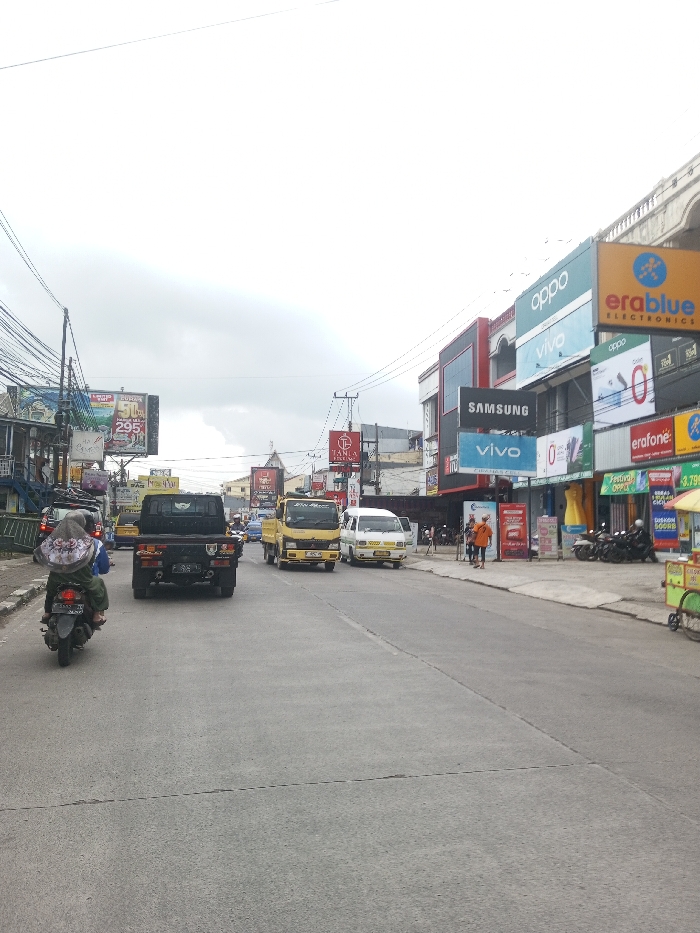 A street scene shows a road with several vehicles, including a motorcycle, a black pickup truck, a yellow truck, and a white van. Buildings line the right side of the road, adorned with large advertisements for electronics brands like OPPO, Vivo, Samsung, and Era Blue. A small food cart sits on the edge of the sidewalk. Above, an overcast sky dominates the scene. The road is gray, and the buildings have multiple stories. Power lines stretch across the sky.