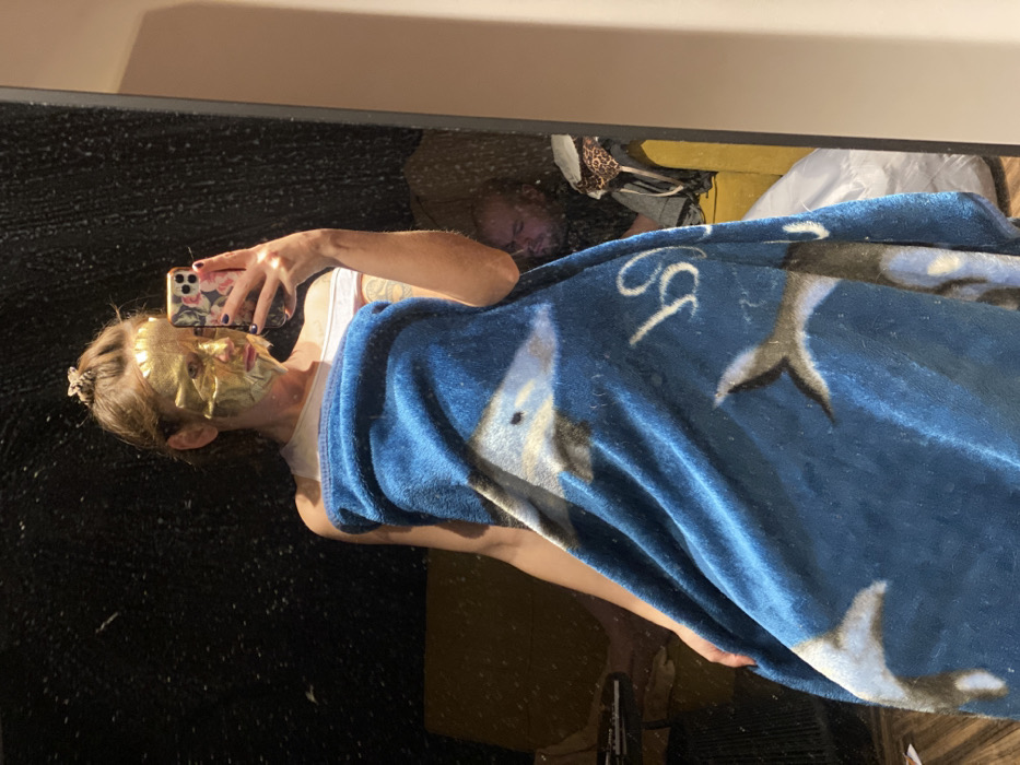 A person is taking a selfie in a mirror while wearing a gold face mask and covered with a blue dolphin-print blanket. The person holds a phone with a floral case. In the background, reflected in the mirror, there is another person lying on a yellow surface next to belongings. The mirror has a speckled dark pattern on its surface.