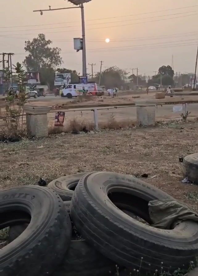 small, paved traffic circle in a dusty-looking urban area at dusk. The setting sun is visible in the hazy sky, partially obscured by power lines. A utility pole with a solar panel and camera is centrally placed on the left of the frame. In the foreground, there is a pile of discarded car tires on the ground, amidst scattered debris and sparse vegetation. Across the traffic circle, various vehicles, including cars, a pickup truck with advertising, and motorcycles are moving or parked. A few pedestrians are also visible in the distance. The overall scene suggests a low-income or developing area, with evidence of both modern infrastructure and neglect.