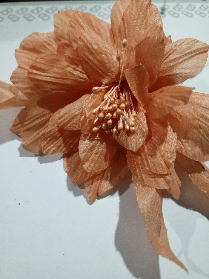 A peach-colored fabric flower with multiple layers of petals sits on a white surface