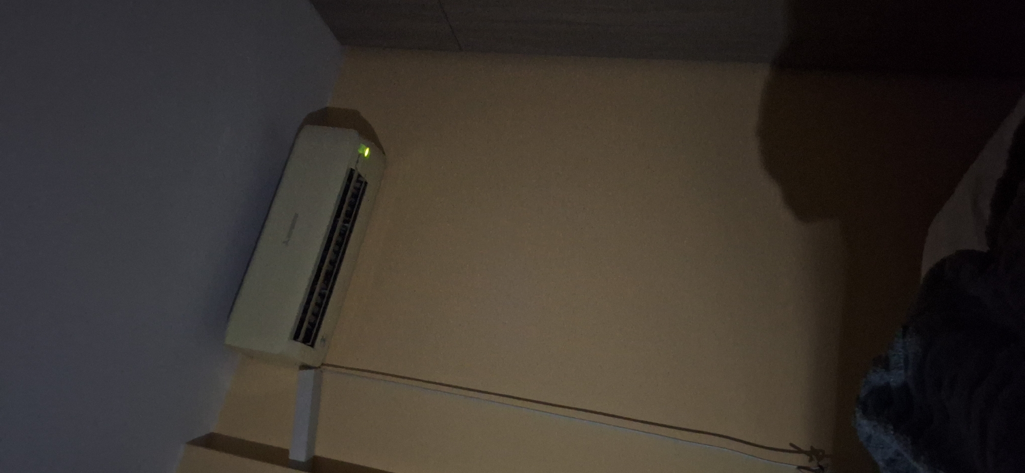 n indoor scene in Varna, Bulgaria. An off-white Mitsubishi air conditioning unit is mounted on a light yellow wall. A green light is illuminated on the unit. The corner of the wall to the left of the unit is painted grey-blue. A thin white support structure is directly below the unit. Electrical wiring runs horizontally along the yellow wall. The upper portion of the wall is shaded, and a portion of a bed and blanket is visible on the right.