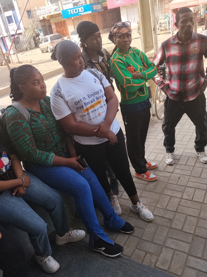 The image displays a street scene in Fagge A, Nigeria, under daylight conditions. Six individuals are present on a patterned paved sidewalk. On the left, two females are seated on a dark ledge: one is partially visible wearing a dark top, blue jeans, and white sneakers; the other, in a green patterned long-sleeve shirt and blue jeans, holds a black smartphone and looks towards the left. Standing to their right are four more individuals. A female wears a white t-shirt with text, a grey beanie, black pants, and light grey sneakers, with hands clasped, also looking left. Behind her, another female in a black top and beanie looks left. A fifth individual, a female, stands wearing a green patterned sweater, a patterned headscarf with sunglasses perched on top, dark pants, and orange sneakers, with arms crossed, looking directly towards the viewer. On the far right, a male in a red and white plaid shirt, dark pants, and white sneakers stands with hands on his hips, looking towards the right. In the background, a street is visible with parked vehicles and buildings featuring commercial signage, including "Pinnacle Cyber Cafe" and "TECNO." A bicycle wheel is partially visible behind the rightmost male.