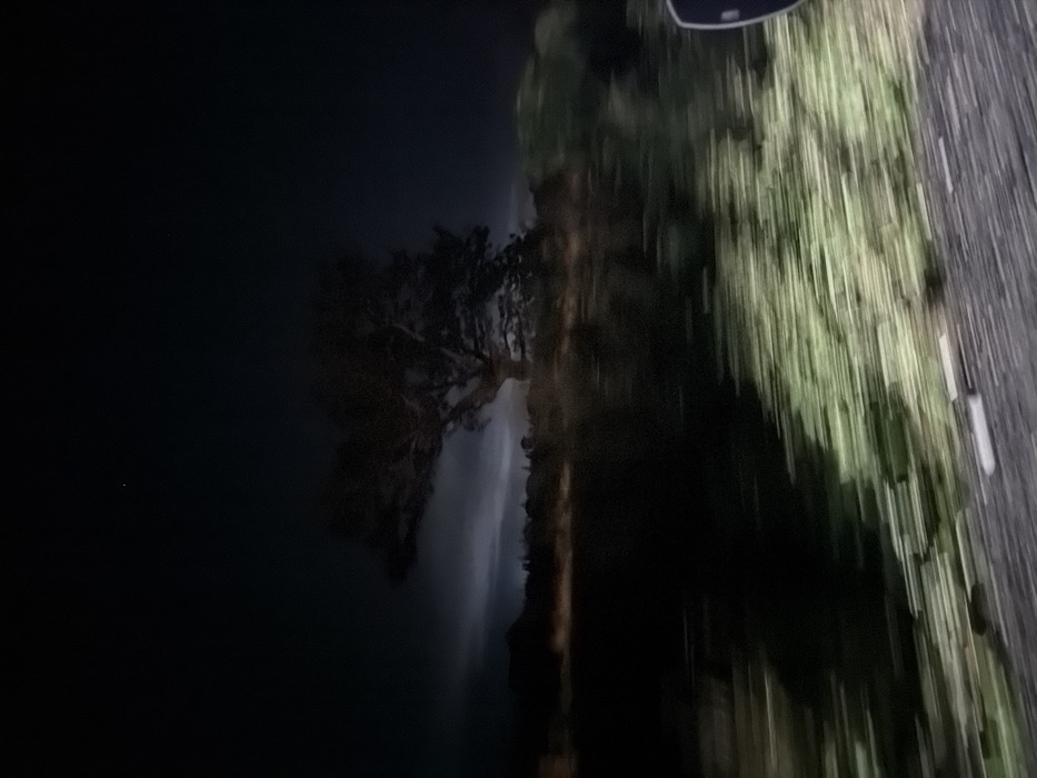 A blurred night scene shows a waterfall cascading down a rocky cliff face. To the left, deep darkness obscures the view, hinting at depth. A silhouette of a tree clings to the cliff edge near the waterfall. On the right, a streak of blurry green suggests foliage, possibly along a road. The image is taken at an angle, adding to the sense of movement and disorientation.