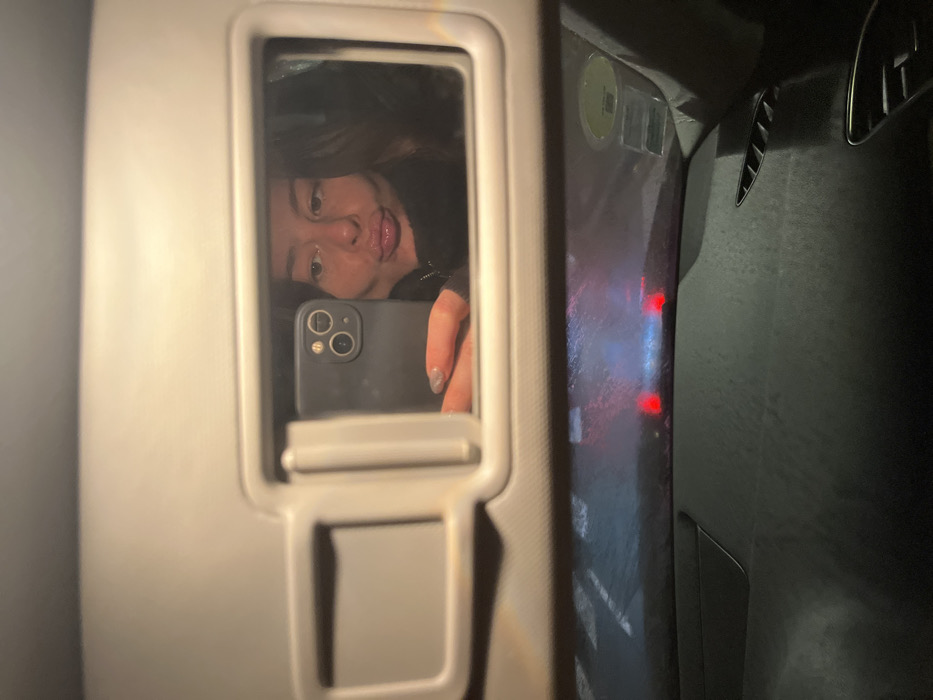 A young woman takes a selfie in a car's vanity mirror