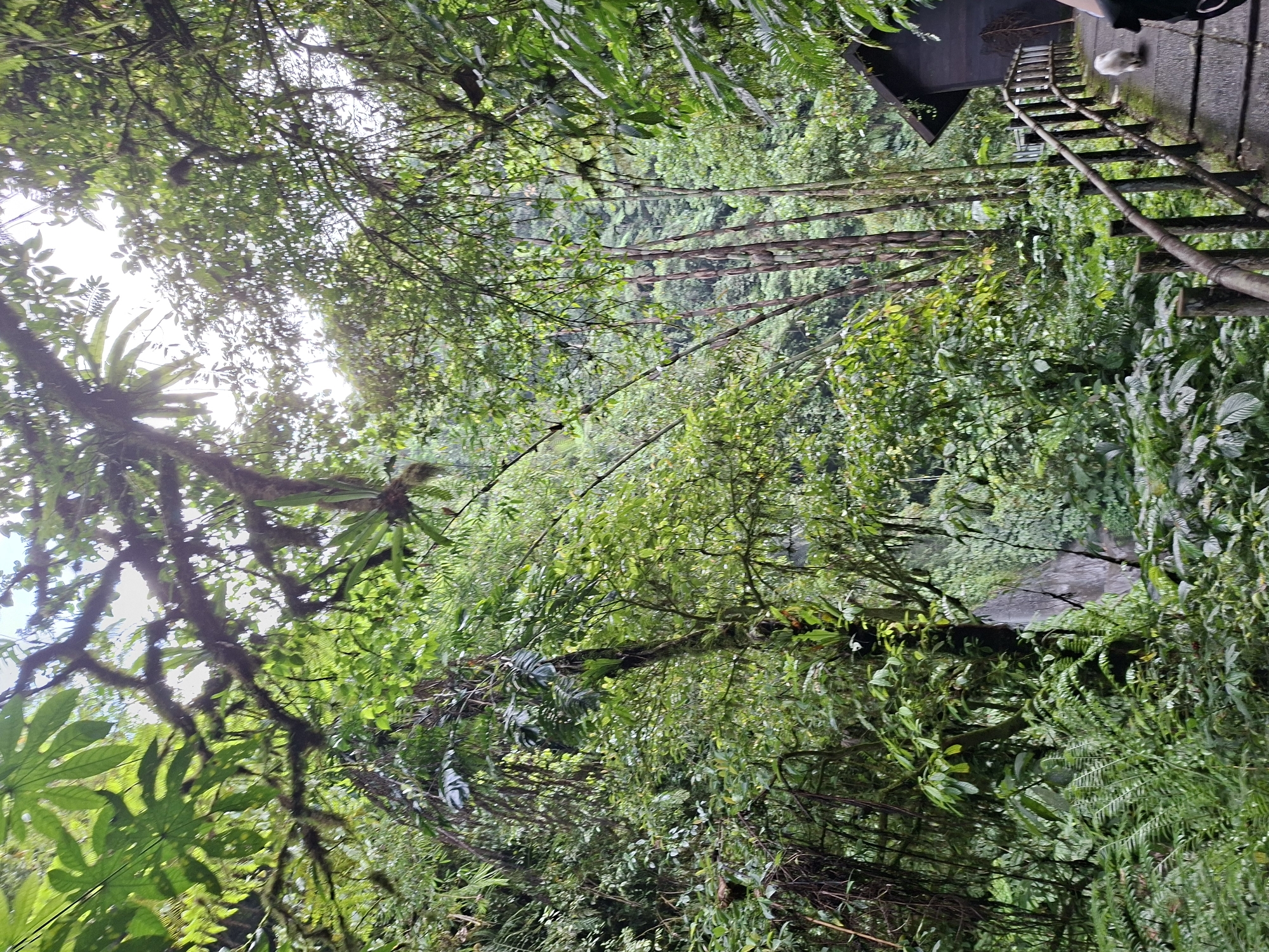The image depicts a lush, green environment, likely a rainforest or dense forest. There is an abundance of foliage including many variations of leaf size and shape. A small waterway or river flows through the scene and there is a bridge or elevated walkway structure in the top right corner with a staircase present. A person is present on the walkway. The sun is shining through the canopy, creating highlights. The location is possibly in Petang, Indonesia.