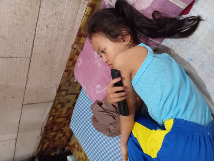 A young female is depicted lying on her left side on a bed within an indoor setting in Baron, Indonesia