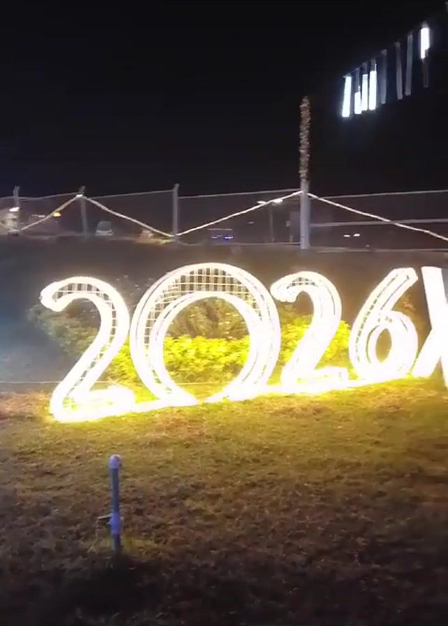 At night, a camera pans to the right, showing large illuminated signs on the grass. The first sign is lit in yellow and reads "2026XMAS". The subsequent sign, lit in white, reads "GARD". A blurry white and blue light fixture in the shape of a butterfly is behind "GARD". A white metal fence lines the background.