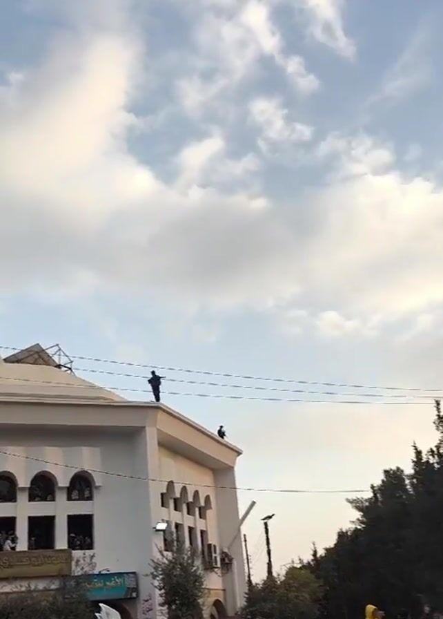 large crowd of people gathered in front of a building. The building appears to be a community center or mosque, adorned with a crescent moon symbol. Some individuals are positioned on the building's roof. The sky above is partly cloudy. The camera pans to show more of the crowd, revealing people holding Syrian flags and chanting. One man is seen taking pictures with his phone. Uniformed individuals, possibly security personnel, are present within the crowd. Tall, bare trees are visible in the background. The atmosphere appears to be festive and celebratory.