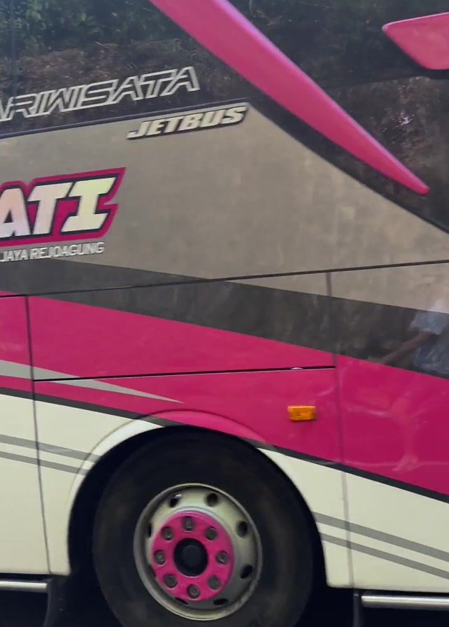 Here’s a detailed description of the video: The video shows a pink and gray tour bus, with the words "Armada Hati" painted on its side. The bus is a "Jetbus 3+" model and is owned by PT Langgeng Jaya Perkasa. The bus has a sticker saying "Premium Coach" and a Wi-Fi symbol. The bus passes by a white car on a winding road surrounded by trees. The video also features the sound of a bus horn.