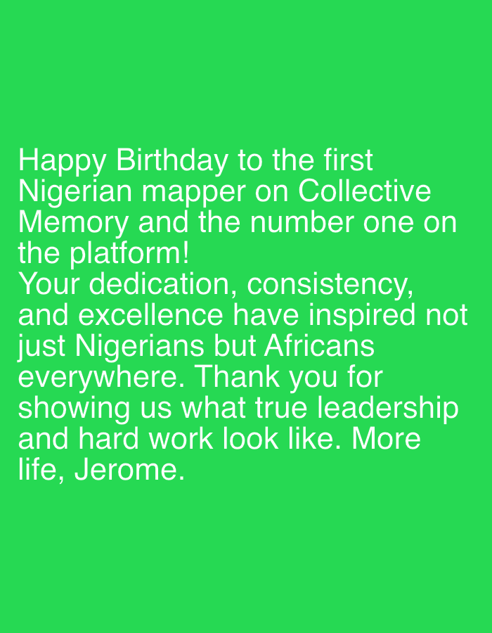 The image contains a birthday message to Jerome, the first Nigerian mapper on Collective Memory and number one on the platform