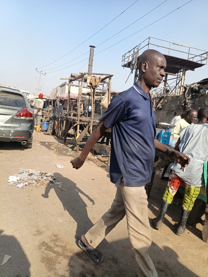 The image depicts an outdoor street or market scene in Kofar Mazugal, Nigeria, under a clear blue sky. In the foreground, a bald, dark-skinned adult male walks from left to right. He wears a navy blue short-sleeved polo shirt with a white stripe on the collar, light brown trousers, and dark flip-flops. His right arm is bent at the elbow with a closed fist, while his left arm is extended backward. A distinct shadow of his figure is cast on the dusty ground ahead of him. To the right of the walking man, partially obscured, an individual stands near a wooden market stall, wearing a light grey tunic over multi-colored patterned trousers (red, green, yellow) and dark boots. A blue and white weighing scale is visible on the stall surface near this person. The background is filled with numerous makeshift market structures constructed from rough wooden planks and corrugated metal, some appearing worn or dilapidated. Overhead power lines traverse the scene. A prominent metal chimney-like pipe extends vertically from one of the structures in the mid-ground. The rear section of a silver SUV is partially visible on the far left. Scattered refuse and debris, including plastic and paper, are present on the dirt path. In the mid-ground on the left, another person wearing a red hat is visible near a blue barrel, adjacent to the SUV.