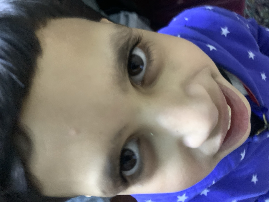 A young child with dark hair and eyes looks up at the camera. The child wears a blue hoodie with white stars. The camera angle is close and angled, focusing on the child's face. Part of their tongue is visible in a slight smile. The background is blurred, suggesting a casual, indoor setting. The child's expression appears friendly and inquisitive.