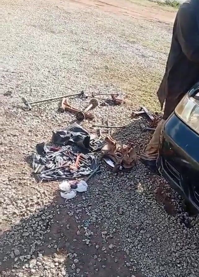 A mechanic is working on a dark green Honda automobile with its hood open. The car is parked on a gravel lot with tools and car parts scattered on the ground nearby. The mechanic, dressed in a dark jumpsuit, is focused on the engine, his hands likely engaged in repair work. In the background, another vehicle, possibly a yellow pickup truck, can be seen driving on a nearby road. A building is also visible in the background.