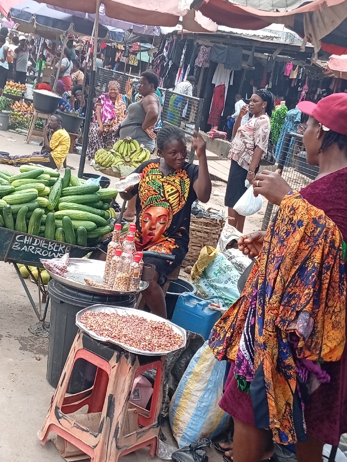 A busy outdoor market scene displays vendors and shoppers. A woman in a graphic T-shirt gestures, standing near peanuts for sale on a stool. A table nearby is piled high with cucumbers. Other vendors sell bananas and clothing. The market is crowded with people, umbrellas for shade, and various goods. The atmosphere suggests a lively, bustling community.