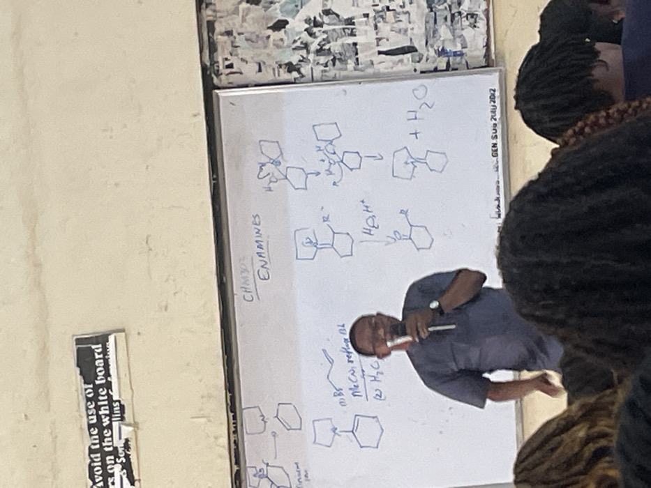 classroom setting, with a professor standing in front of a whiteboard. The whiteboard contains handwritten notes and chemical diagrams. The visible text includes "CHM303 ENAMINES", and chemical reaction mechanisms involving cyclic compounds, an amine, and water. Below, another reaction scheme has "(1) Br, MeCN, reflux RL", and " (2) H2O". A warning sign reading "Avoid the use of... on the white board..." is also present. The date "GEN. Sus 20ly 2012" is visible on the upper right of the board.